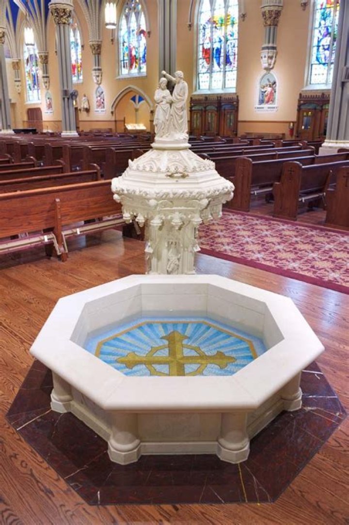 An Orthodox baptismal font holds water used during the sacrament of Baptism . A baby is typically submerged into the water during the service - an adult - poured water over the head over the baptismal font. Historically, baptism in a basin (vs the river) evolved as a practice when Christians were persecuted and had to practice the Sacrament of baptism indoors in secret.