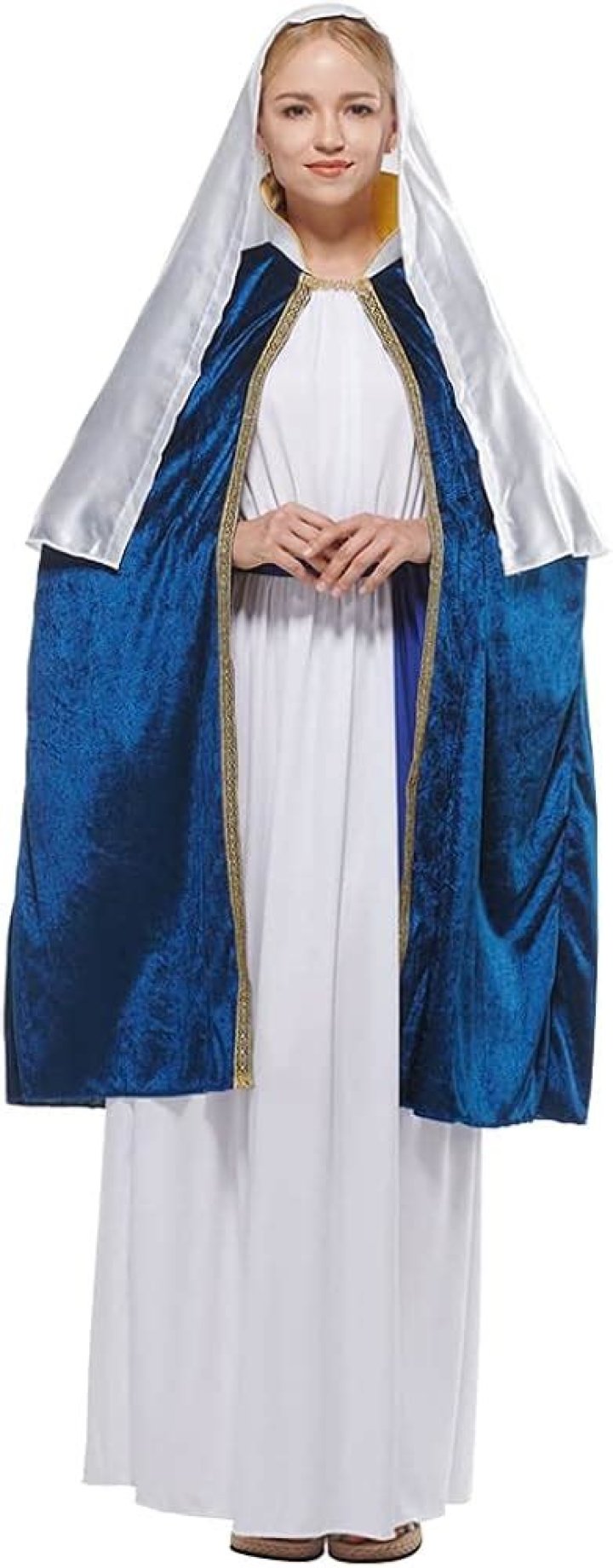 education | January 19, 2026 Christmas Mary Costume Deluxe — Blessed Celebration SKU COS-Xmas-443308 The costume consists of • velvet dress • cape • gold halo • cord beltSizing: 4, 6, 8, 10