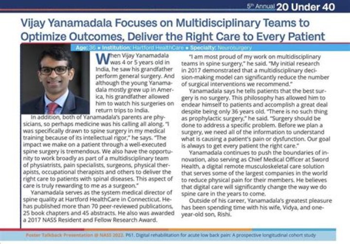 Dr. Yanamadala received the William H. Sweet Young Investigator Award in 2017 from the American Association of Neurological Surgeons for his work on improving the safety and efficacy of spine surgery.