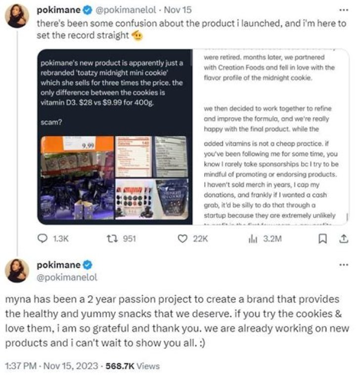 Moreover, the user also included a direct comparison of the nutritional value and ingredients in both Pokimane’s product and Toatzy’s, claiming that it is possibly a “cash grab attempt.” This stems from the fact that Pokimane’s new product appears to be a “rebranded Toatzy Midnight Mini Cookie,” and that “the only difference between the cookies is Vitamin D3.”