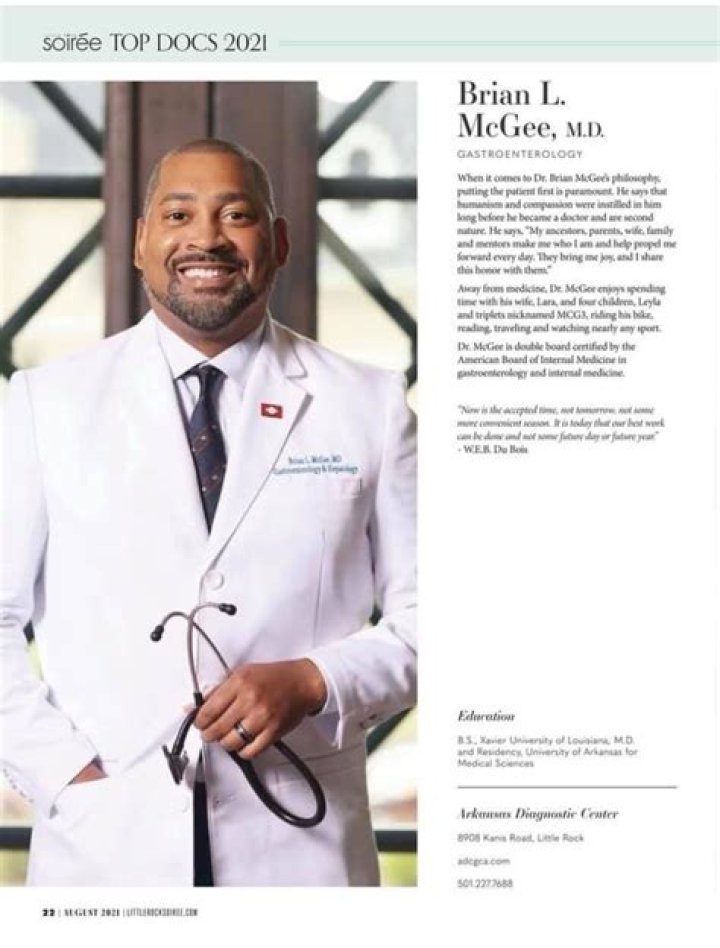 Dr. Brian McGee is a a Marion, Arkansas native and graduate of Xavier University in New Orleans and UAMS, he started his career working with underserved communities in Hot Springs and Benton. Board-certified in internal medicine, McGee received honors in sciences, English and history at Xavier and decided to pursue medicine, following in the footsteps of his mother’s college roommate and friend, the late Marion Barr, M.D., and his older sister, Ivy, who completed medical school at UAMS. McGee completed his internal medicine residency and gastroenterology fellowship at UAMS.