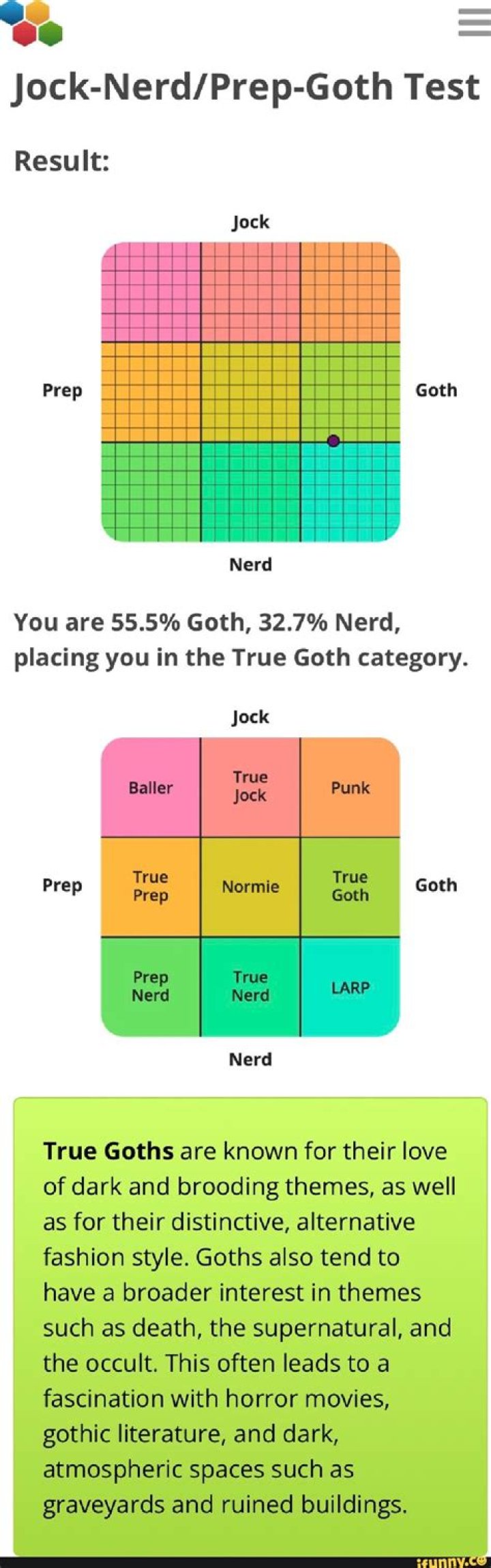 According to Hitc, individuals can take the Jock, Nerd, Prep, Goth chart test by going on IDRLabs‘ website. The participant will be asked 22 questions and answer with either a “thumbs up, a thumbs down, or a neutral response.”