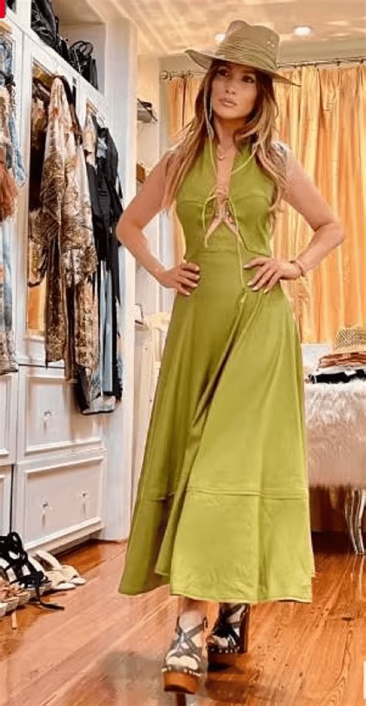 For evening walks and a date with her future husband, actor Ben Affleck, Jennifer picked up a flowing olive Cult Gaia maxi dress with an unusual design of the neckline, secured with a gold buckle. In addition to the outfit, the singer wore a straw hat and platform sandals, popular with designers in the spring-summer 2022 season.