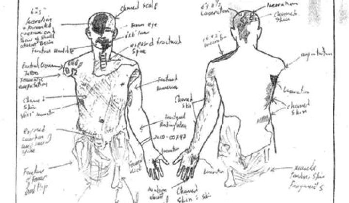 Injuries to the calvarium, dura, liver laceration, transected upper cervical cord, left lung laceration, left kidney laceration, spleen laceration, aorta laceration, and heart laceration were also depicted.