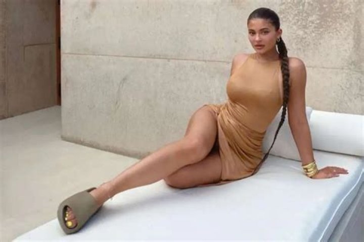 You may see a photo of Kylie Jenner as she wears Yeezy slides and poses on a white sofa below.