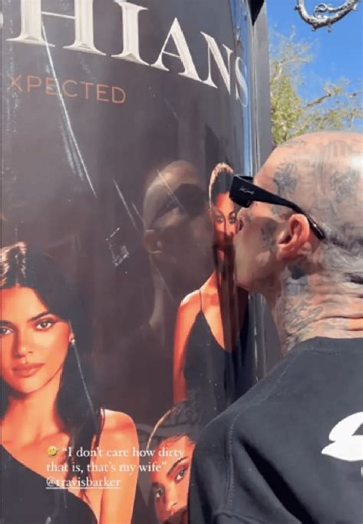 The drummer for Blink-182 can be seen placing a kiss on the public poster showing his wife in an Insta Story published by the reality star on Friday and afterward shared by the artist. A poster was displayed to publicize the upcoming season of The Kardashians on Hulu.