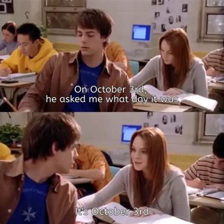 Recommended VideosFor those who haven’t bathed in the glory that is Mean Girls, the significance of October 3rd was borne out of a pivotal scene in the movie when Aaron Samuels (Jonathan Bennett) turns to Cady Heron (Lindsay Lohan) in math class and asks what day it was.